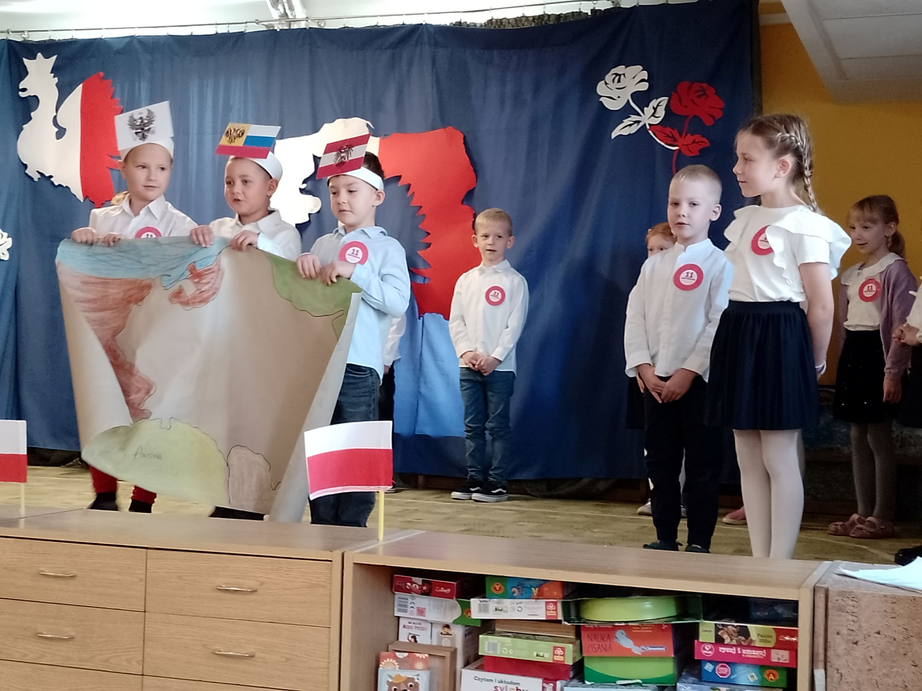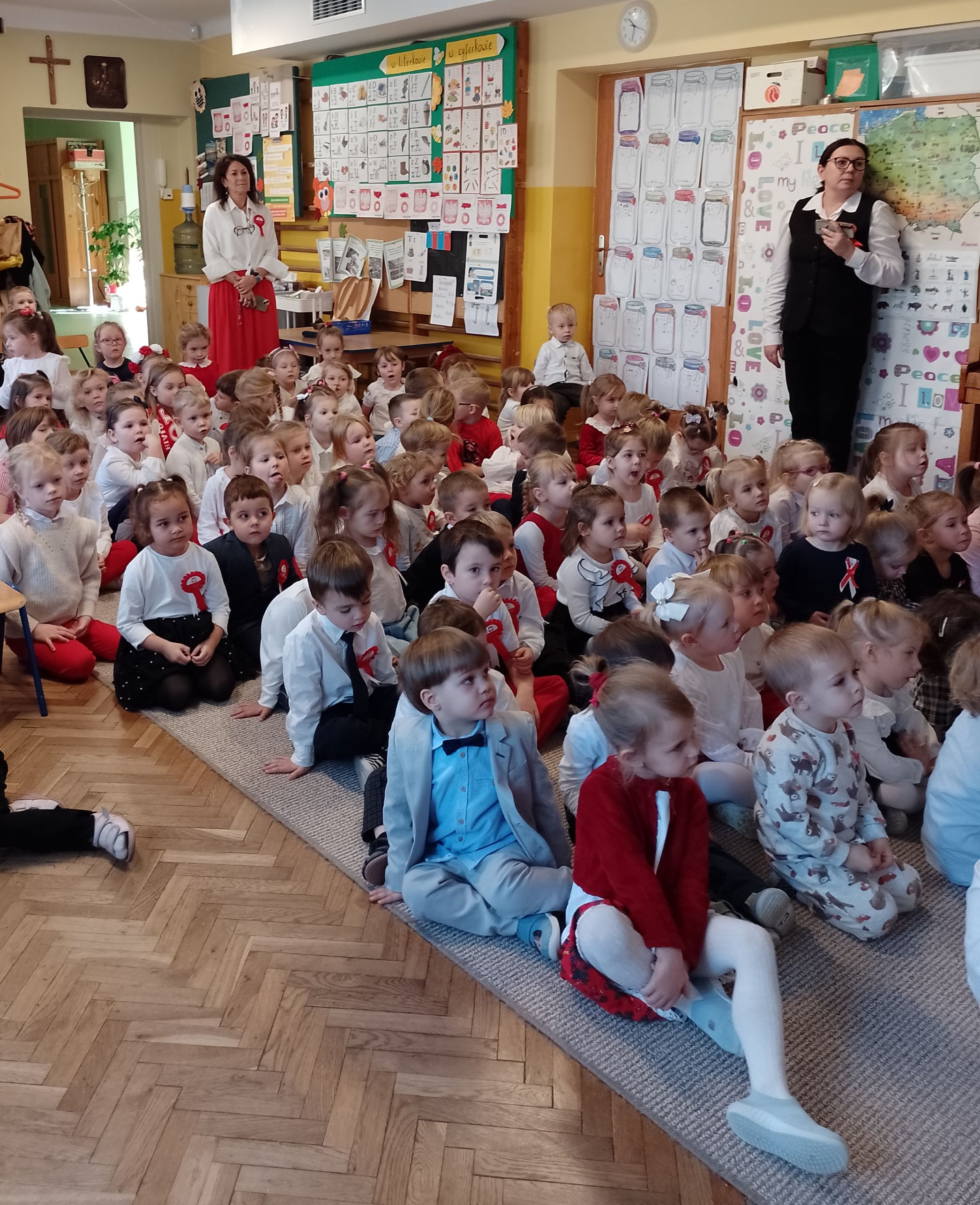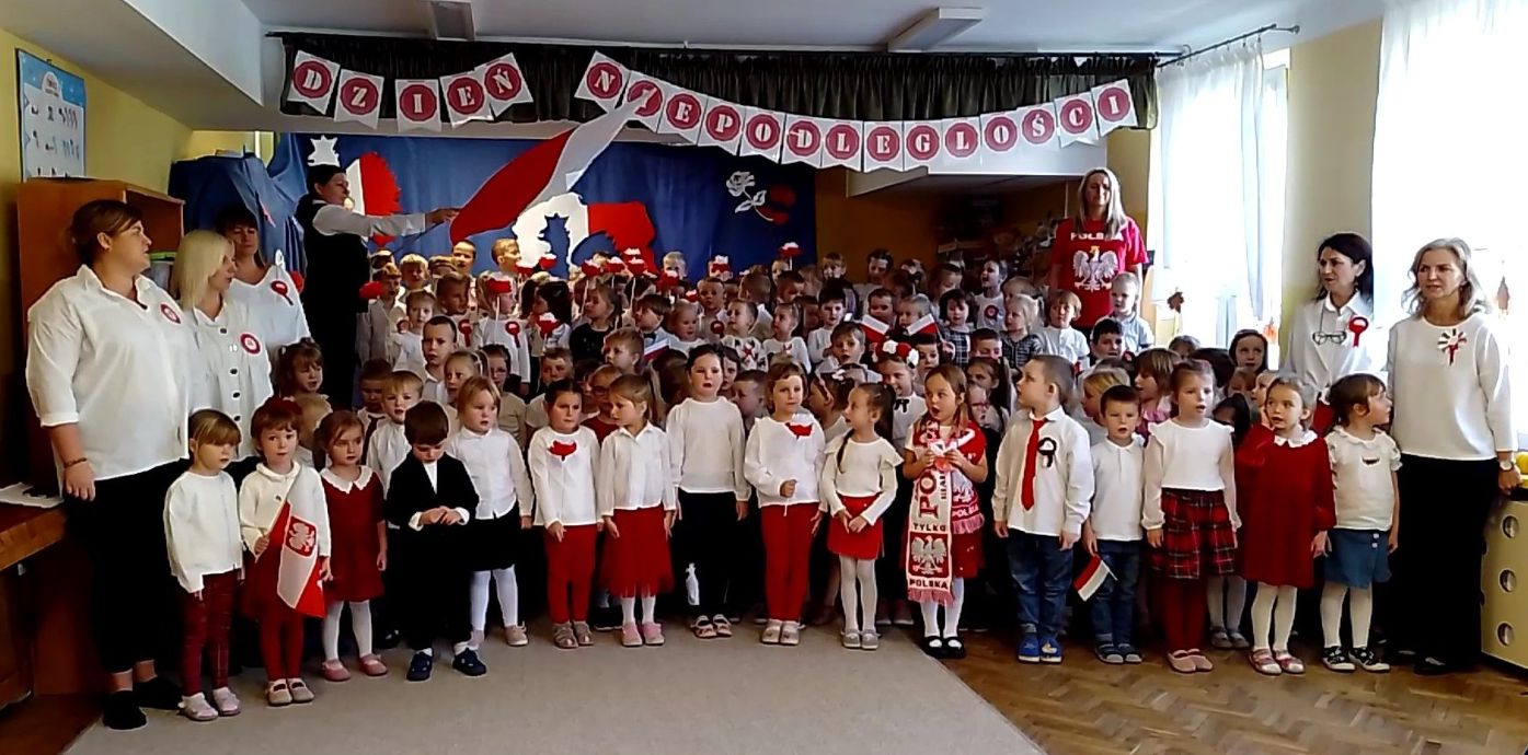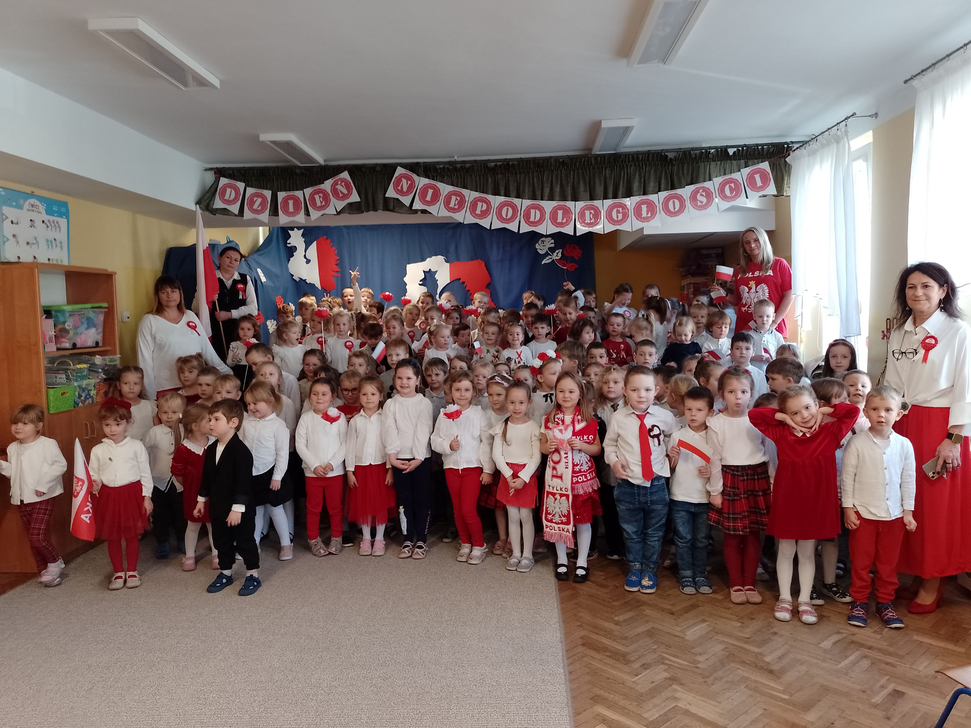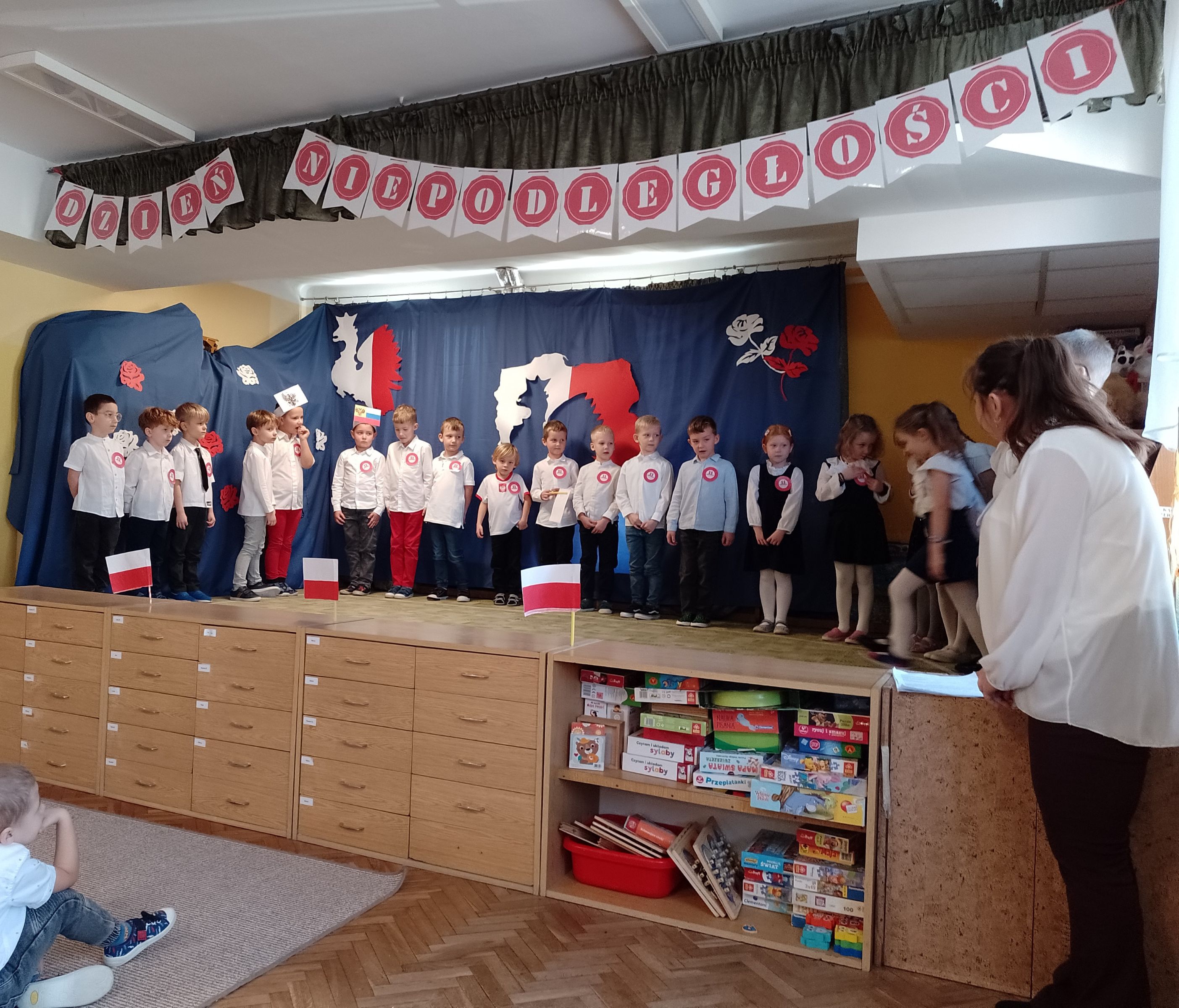 Dnia 7 listopada wszyscy w odświętnych strojach, z kotylionami, flagami w barwach ojczystych zgromadziliśmy się w jednej sali na uroczystości upamiętniającej ten ważny dla Polaków dzień. Na wstępie panie i dzieci z grupy Ważki zaprezentowały krótki rys historyczny dotyczący odzyskania niepodległości. A o godz. 11:11 wszyscy razem odśpiewaliśmy hymn Polski – „Mazurka Dąbrowskiego”.