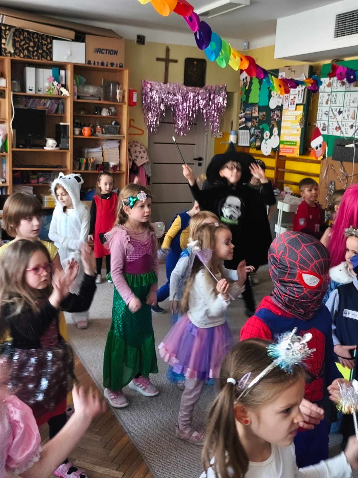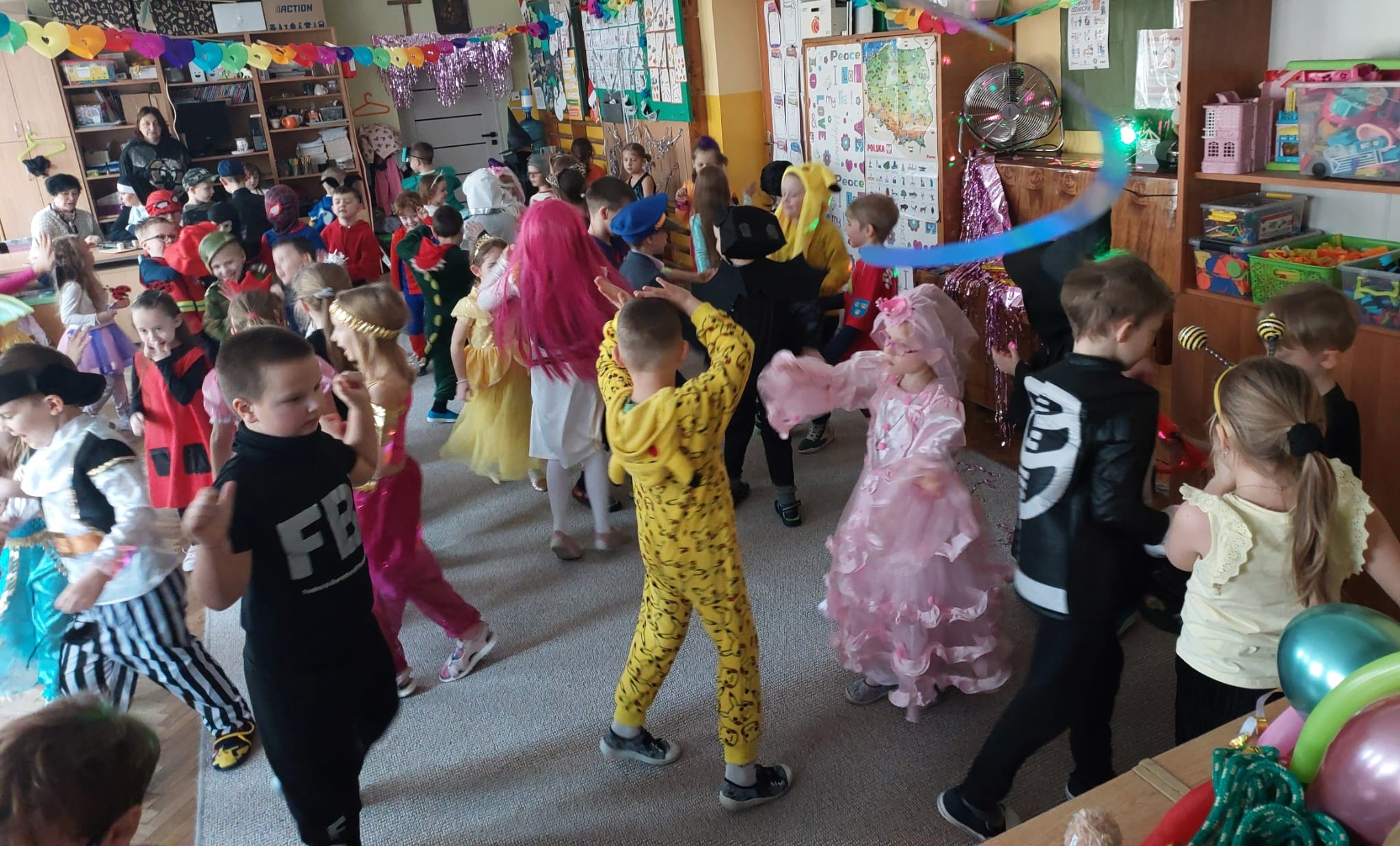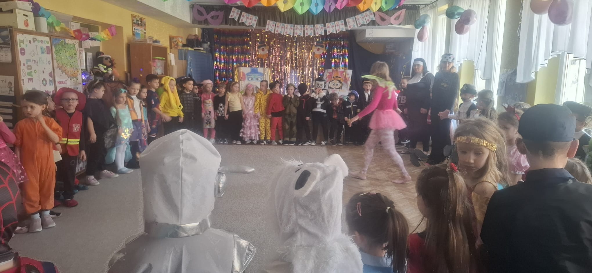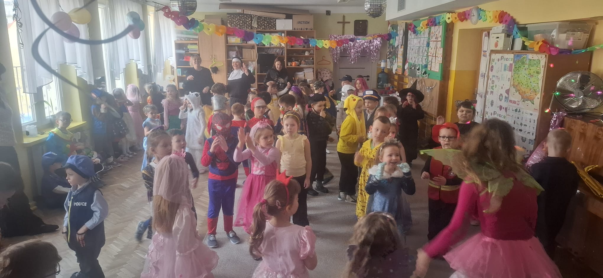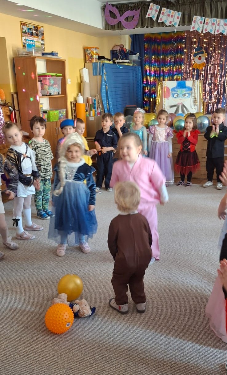 W przedostatni dzień karnawału, w poniedziałek przyszedł czas na Bal Karnawałowy dla naszych przedszkolaków. Dzieci przybyły w kolorowych i pomysłowych przebraniach, a sala zamieniła się w magiczną krainę pełną księżniczek, super bohaterów, zwierzątek i bajkowych postaci. Przy wesołej muzyce przedszkolaki chętnie brały udział w tańcach, zabawach i konkursach. Uśmiechy nie znikały z ich twarzy.
