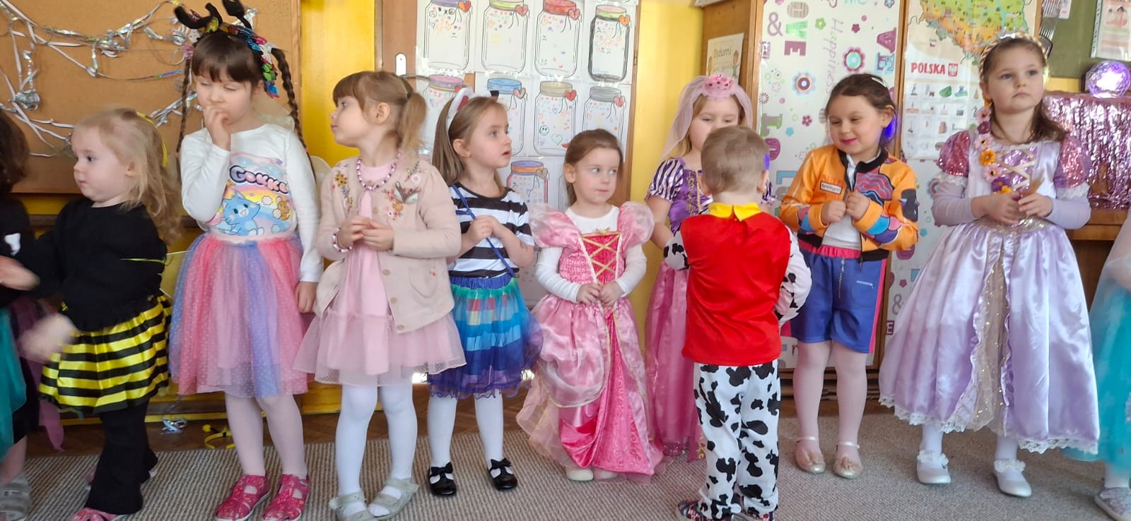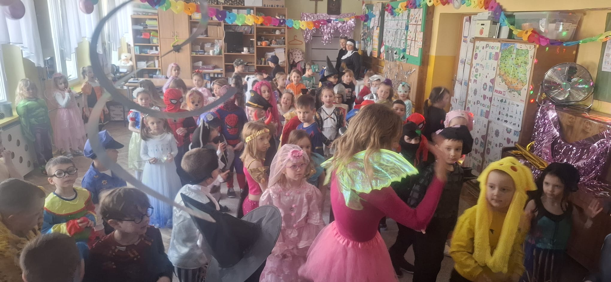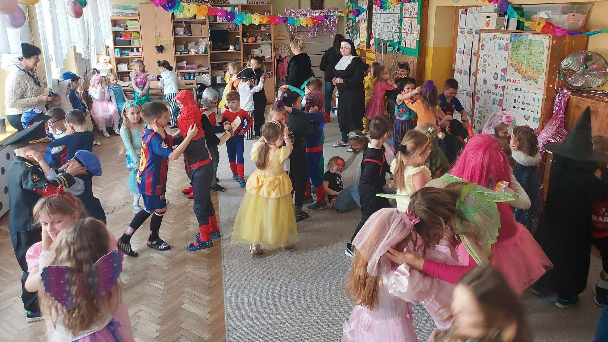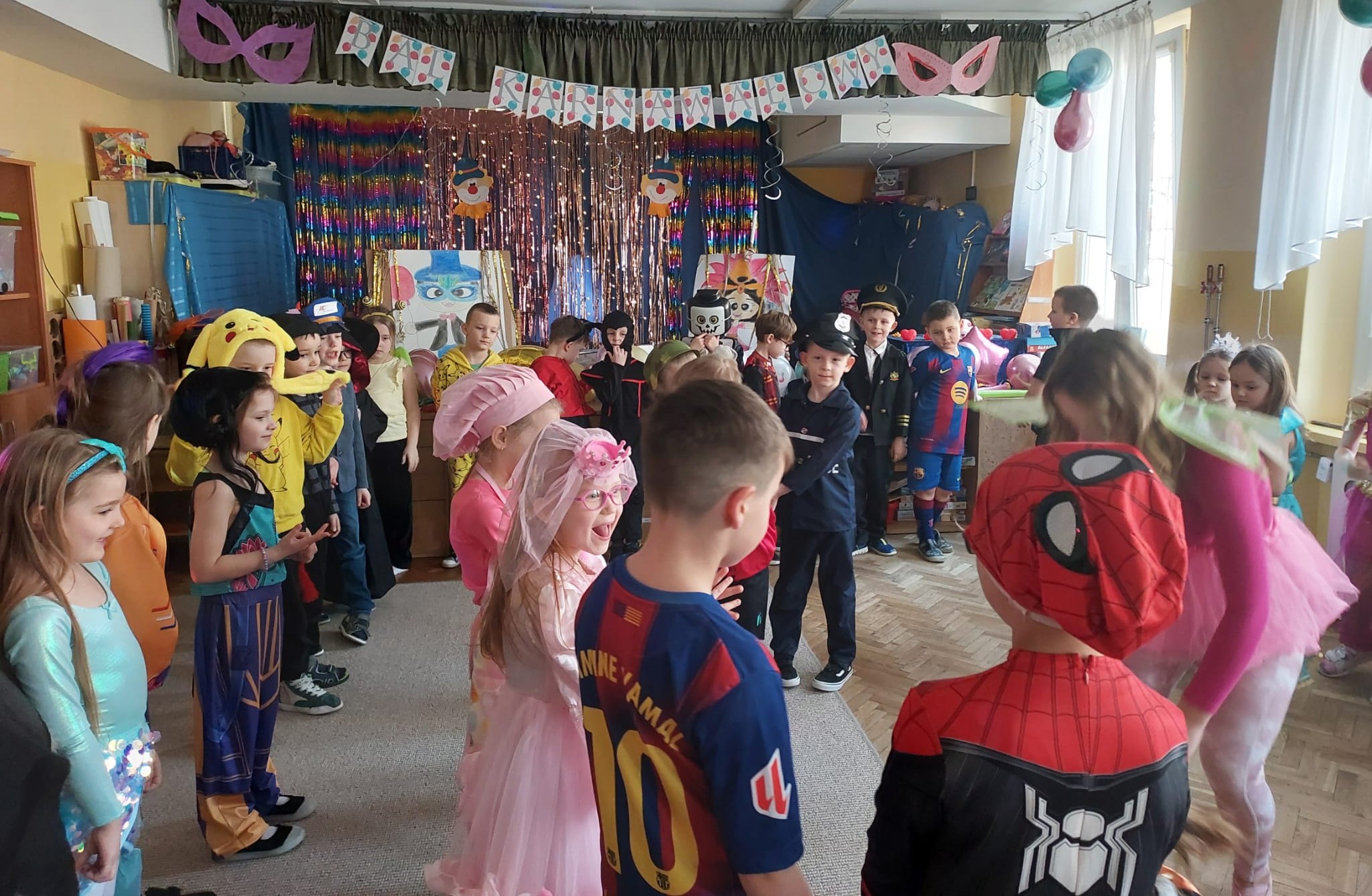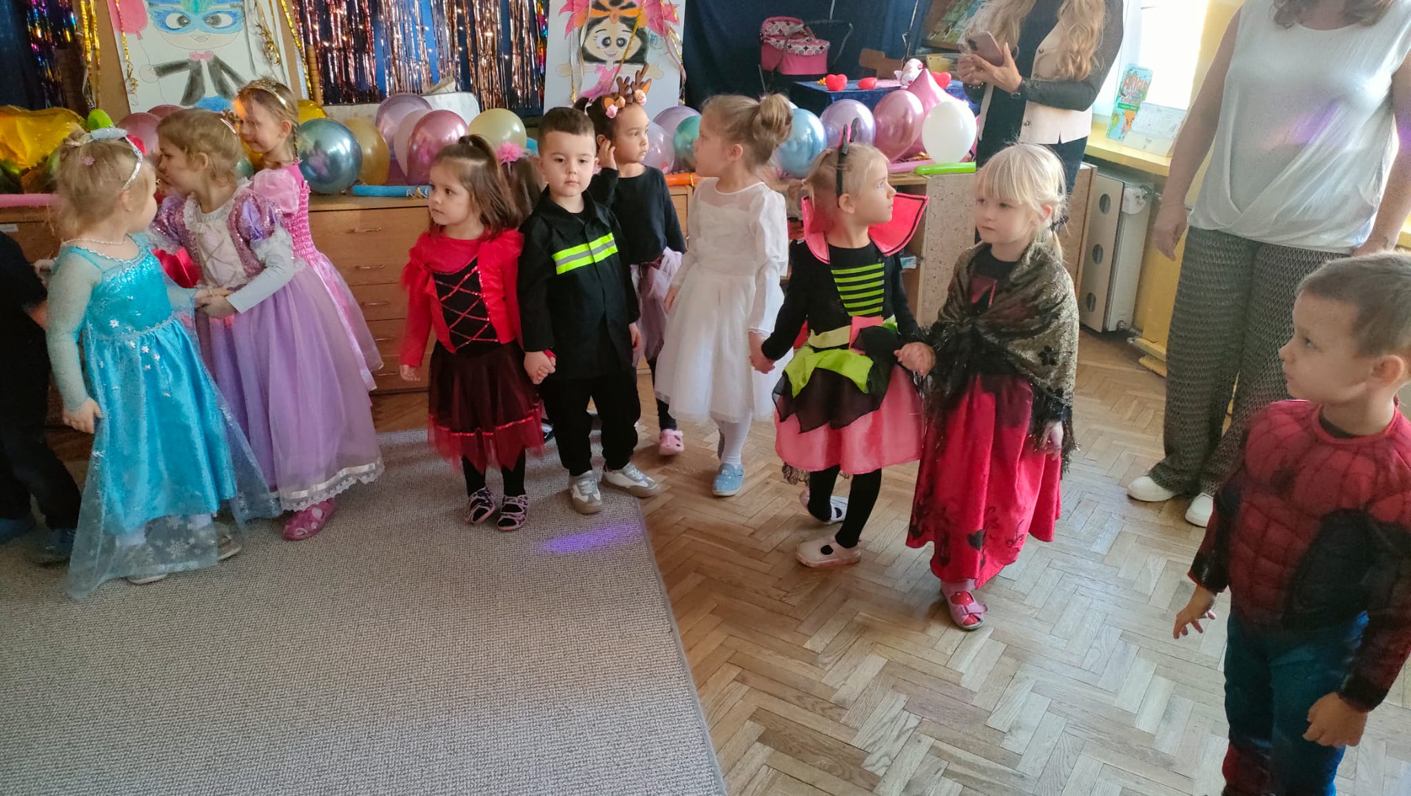 W przedostatni dzień karnawału, w poniedziałek przyszedł czas na Bal Karnawałowy dla naszych przedszkolaków. Dzieci przybyły w kolorowych i pomysłowych przebraniach, a sala zamieniła się w magiczną krainę pełną księżniczek, super bohaterów, zwierzątek i bajkowych postaci. Przy wesołej muzyce przedszkolaki chętnie brały udział w tańcach, zabawach i konkursach. Uśmiechy nie znikały z ich twarzy.