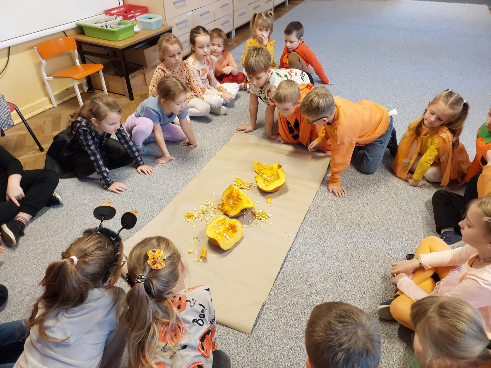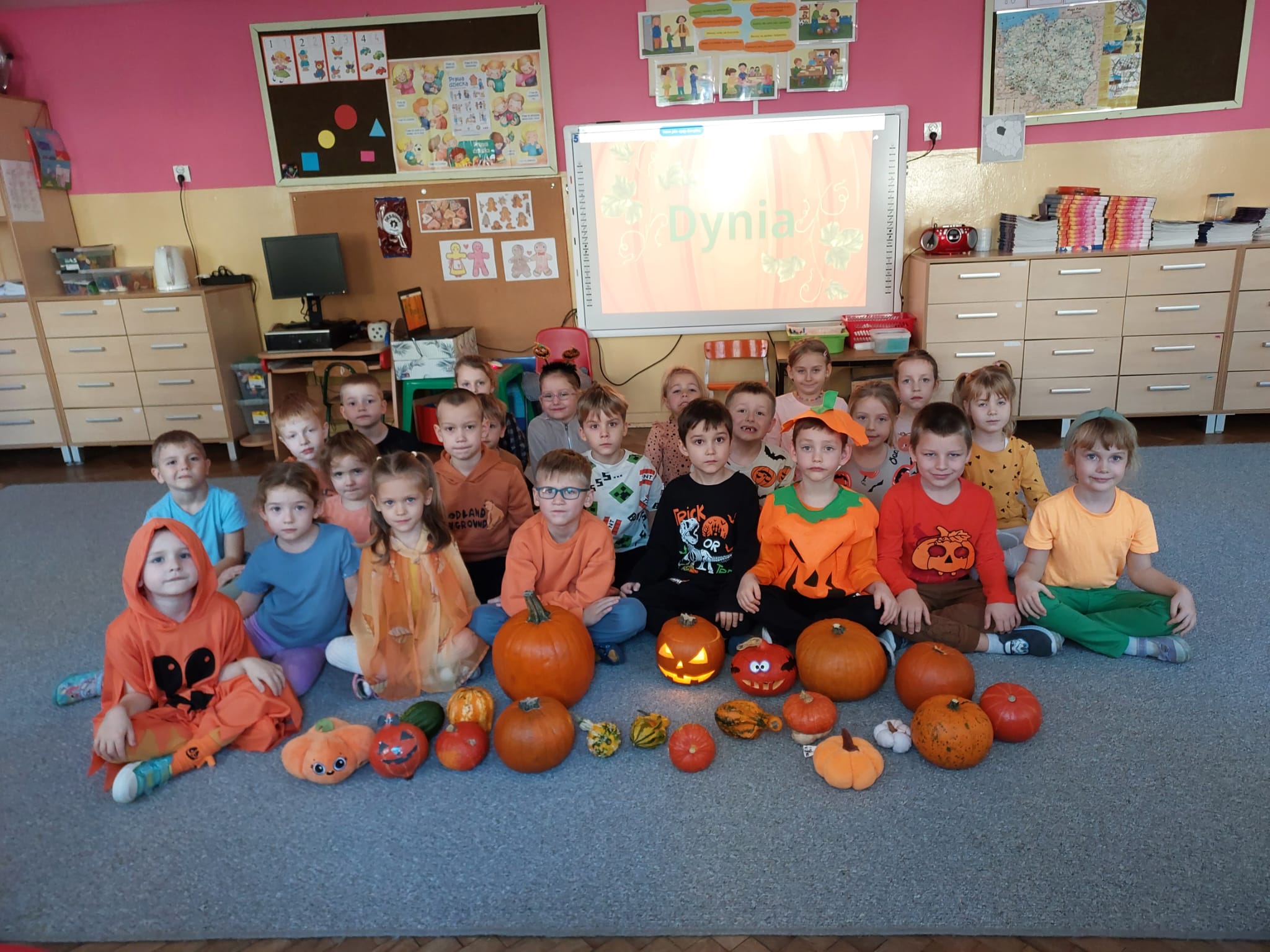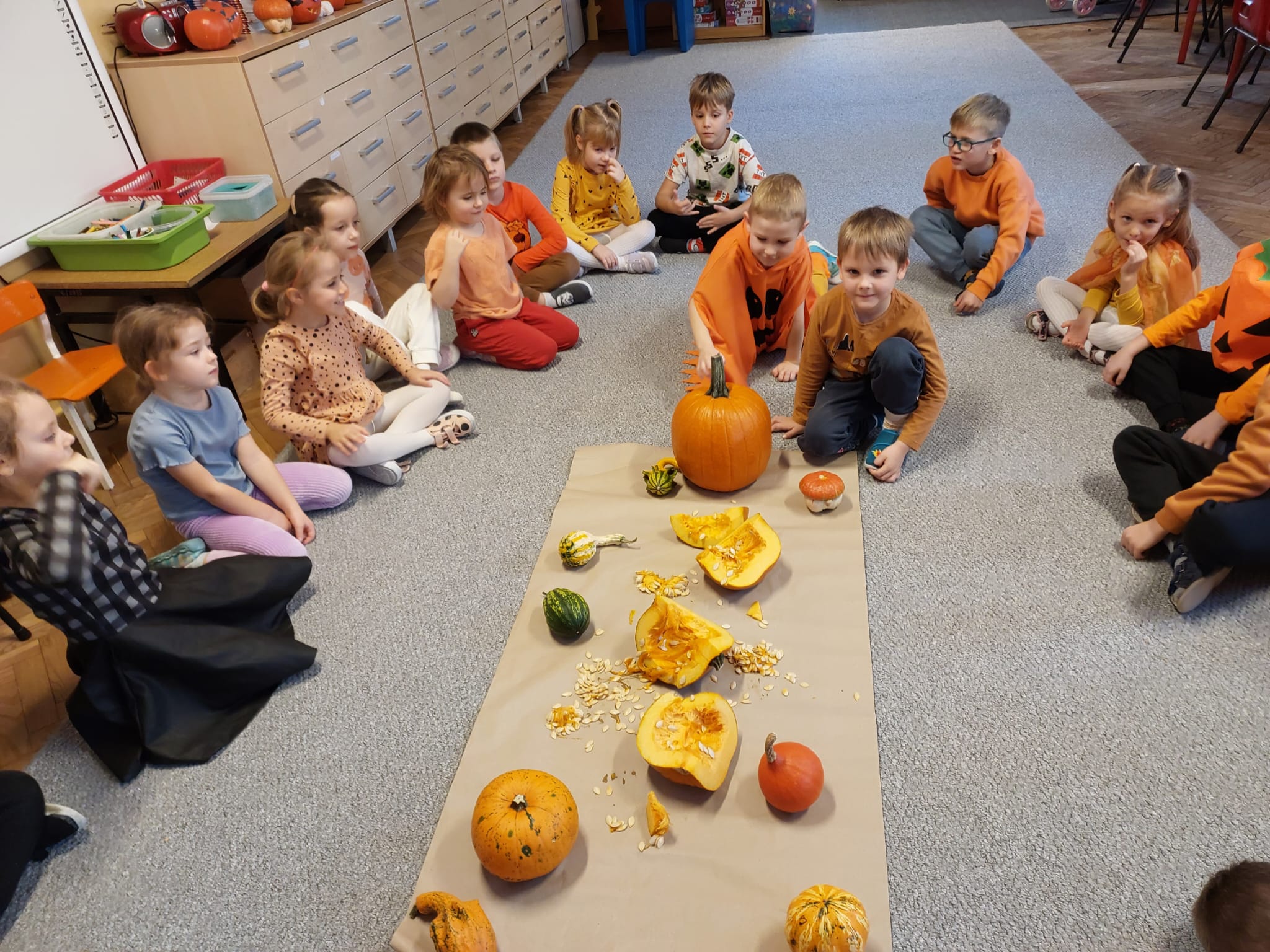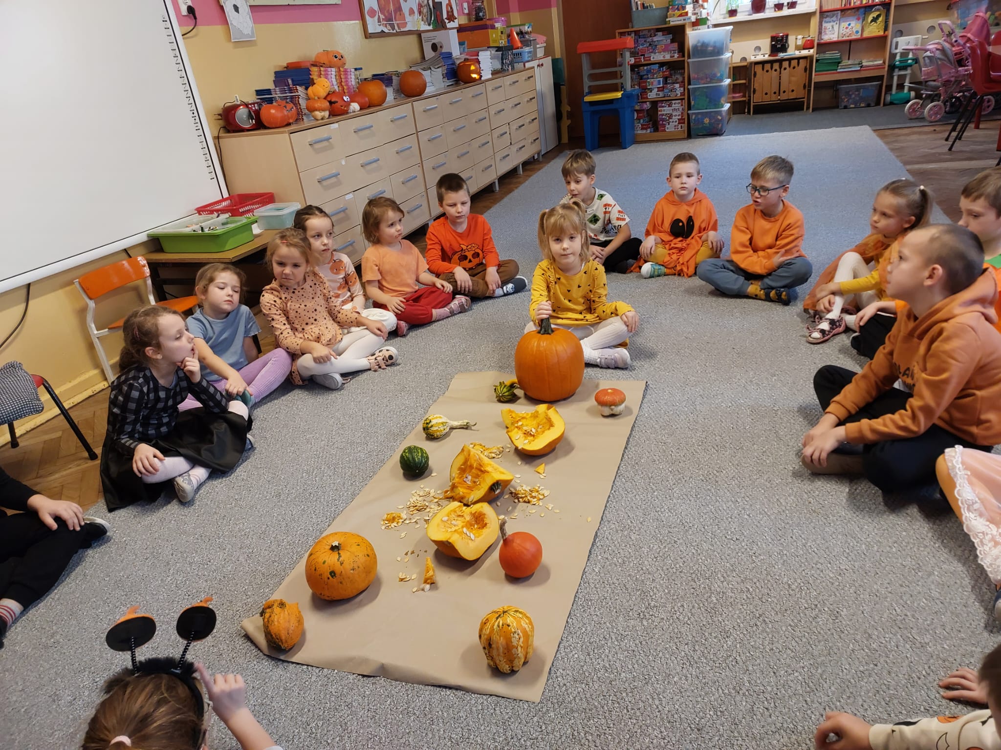 Dzieci z grupy Mrówki podczas zajęć z dynią poznawały ciekawostki na ich temat. Dowiedziały się, jakie gatunki dyń występują i do czego są wykorzystywane, szczególnie kulinarnie. Przy okazji porównywały, przeliczały i segregowały różne dynie.