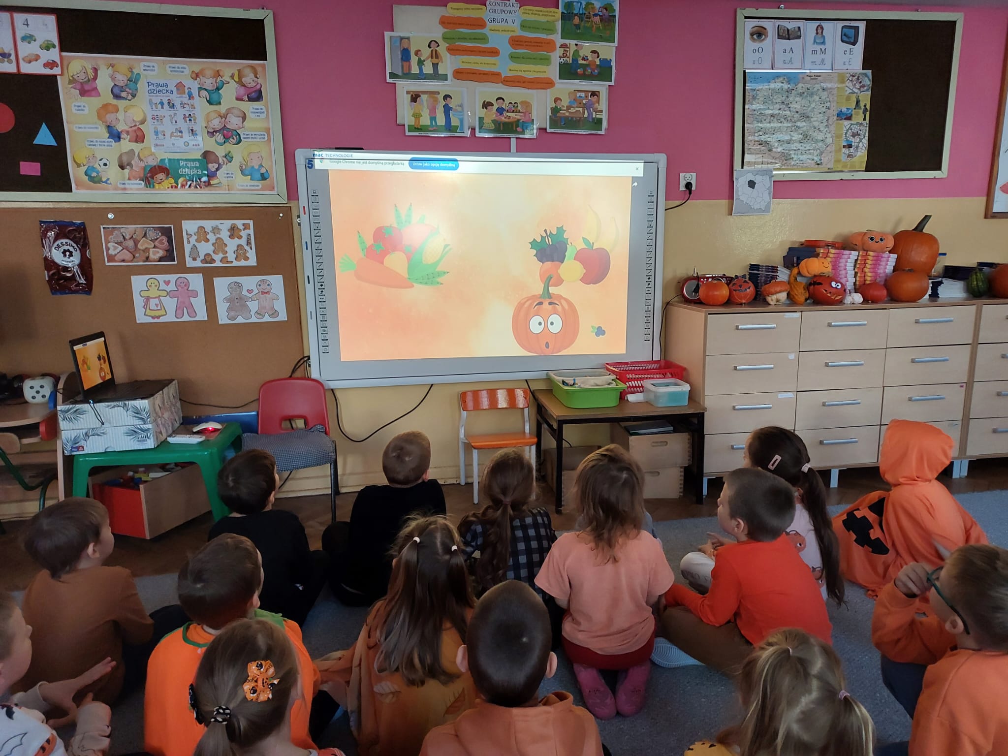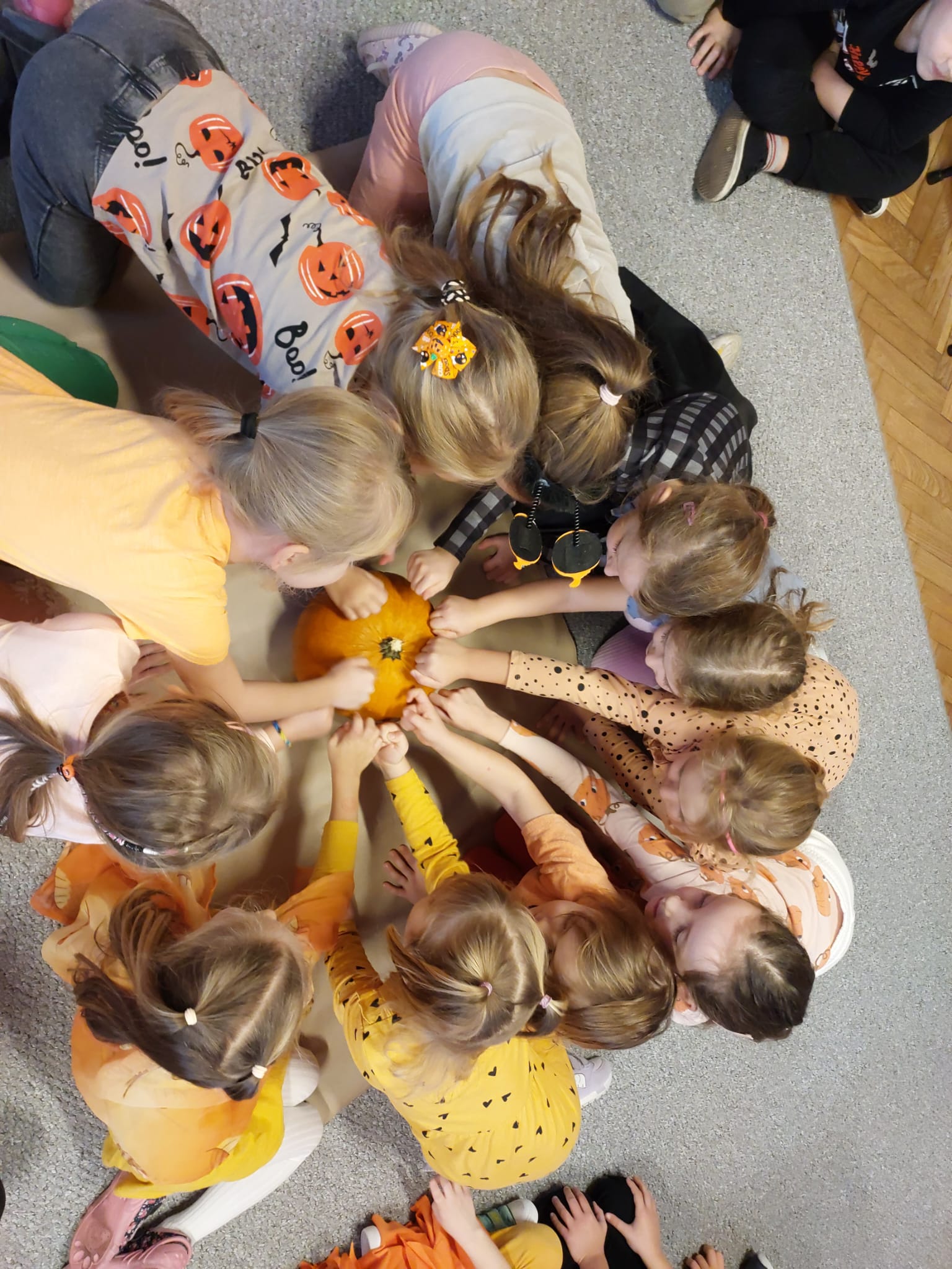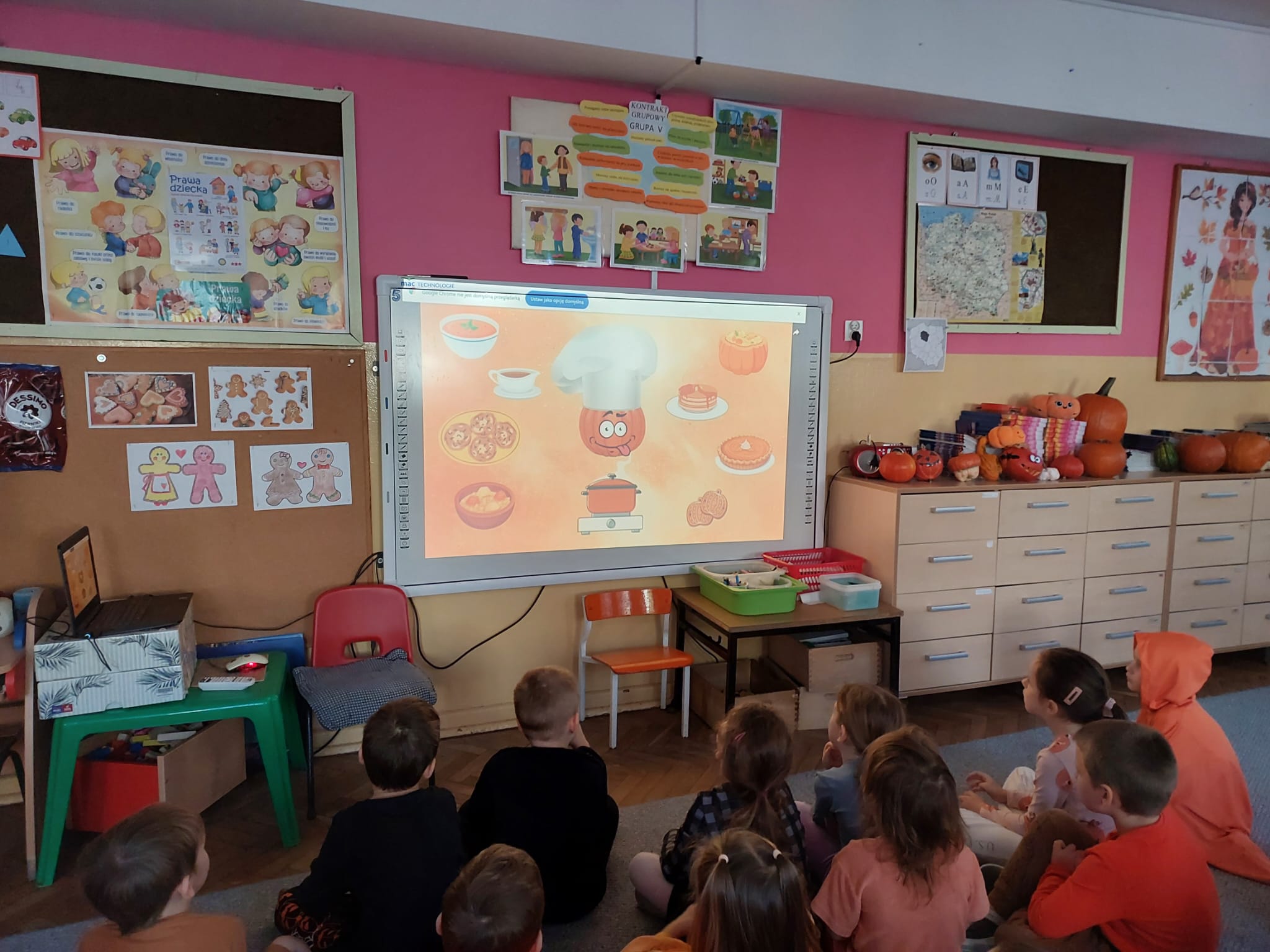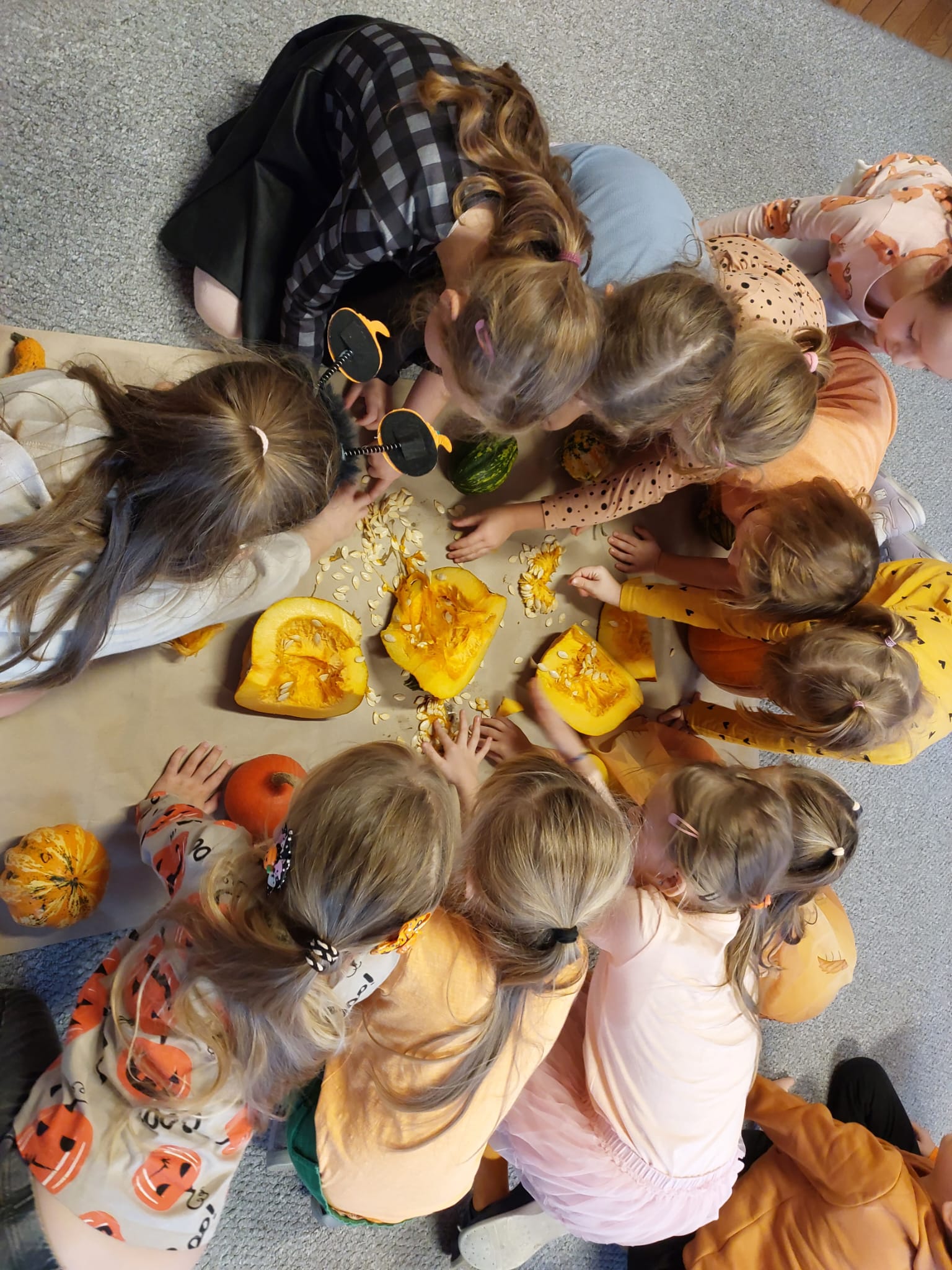 Dzieci z grupy Mrówki podczas zajęć z dynią poznawały ciekawostki na ich temat. Dowiedziały się, jakie gatunki dyń występują i do czego są wykorzystywane, szczególnie kulinarnie. Przy okazji porównywały, przeliczały i segregowały różne dynie.