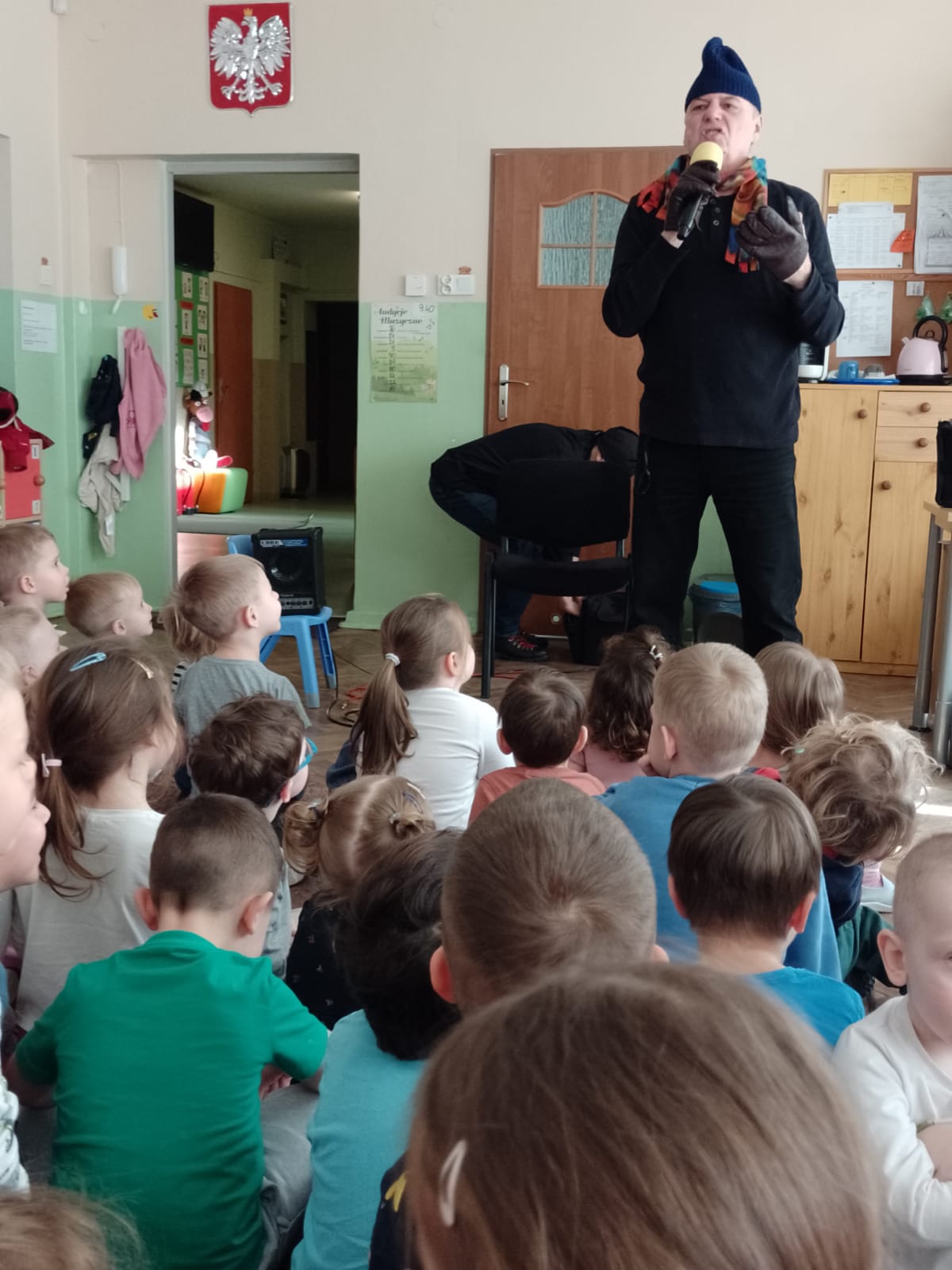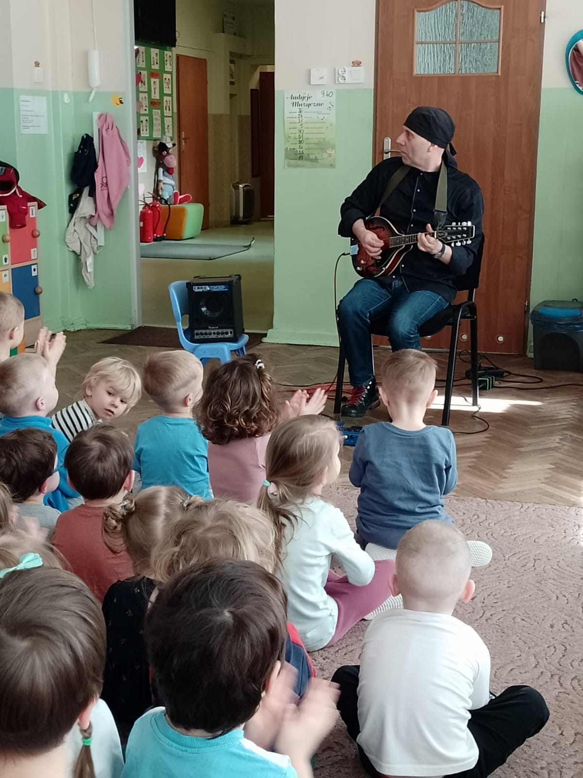 Muzyk zaprezentował brzmienie mandoliny. Dzieci dowiedziały się, że mandolina posiada podwójne struny i najczęściej wykorzystywana jest w muzyce ludowej oraz klasycznej.
