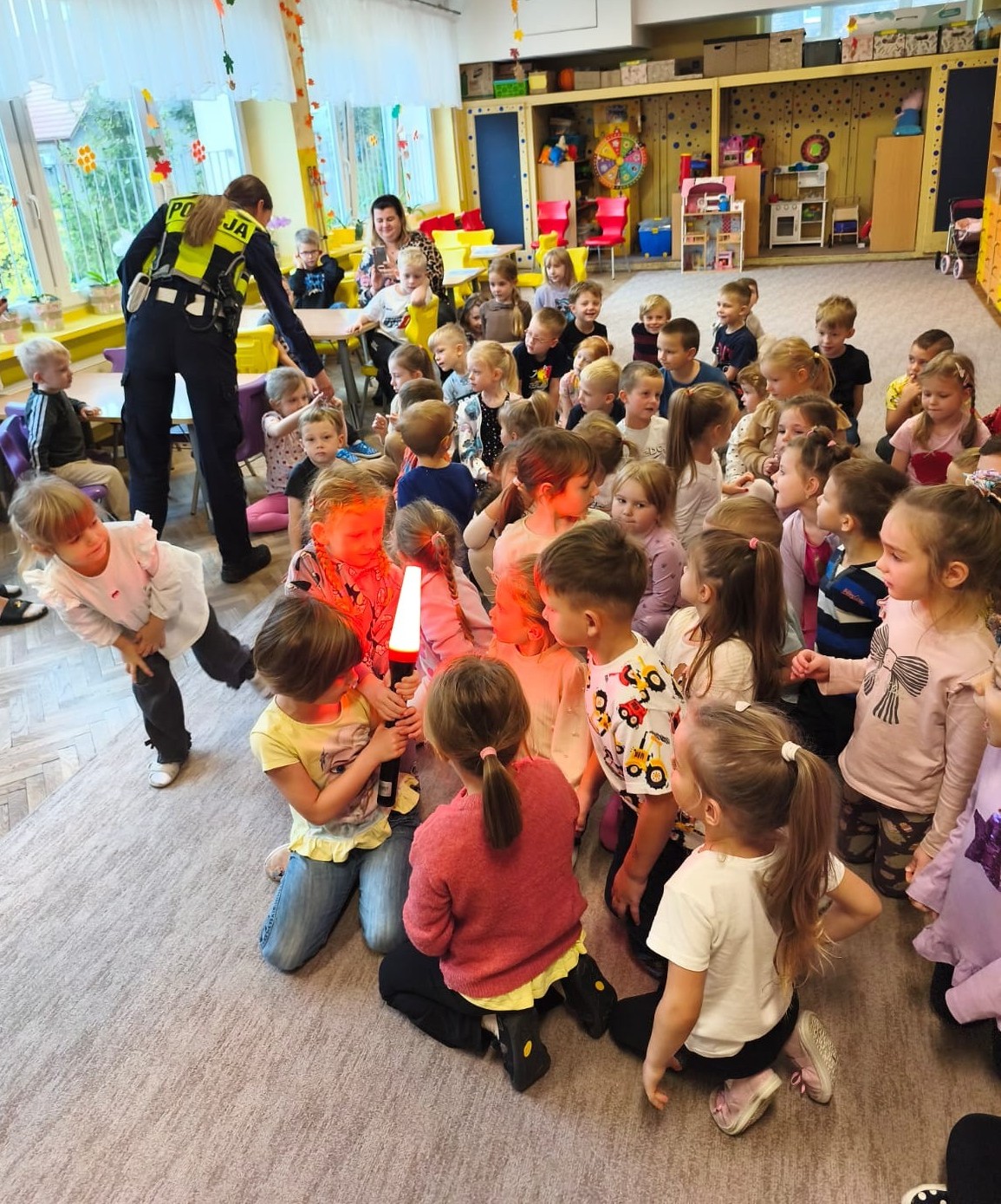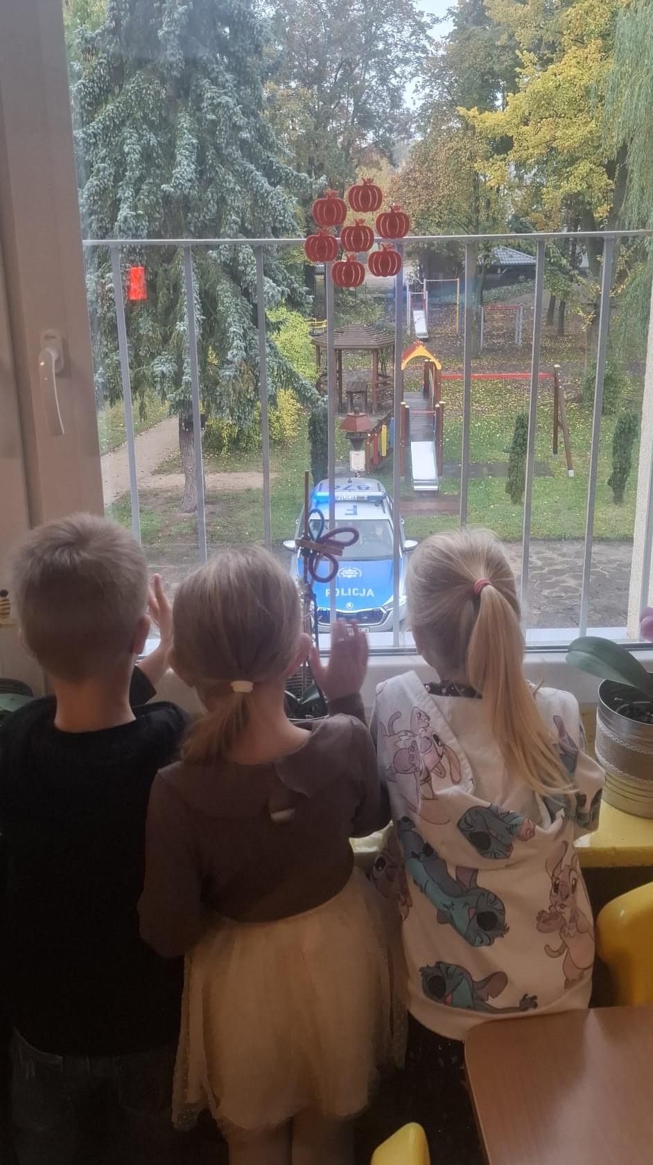 Na zakończenie, ze względu na deszczową pogodę dzieci obejrzały wóz policyjny przez okno, co też było dużą atrakcją.