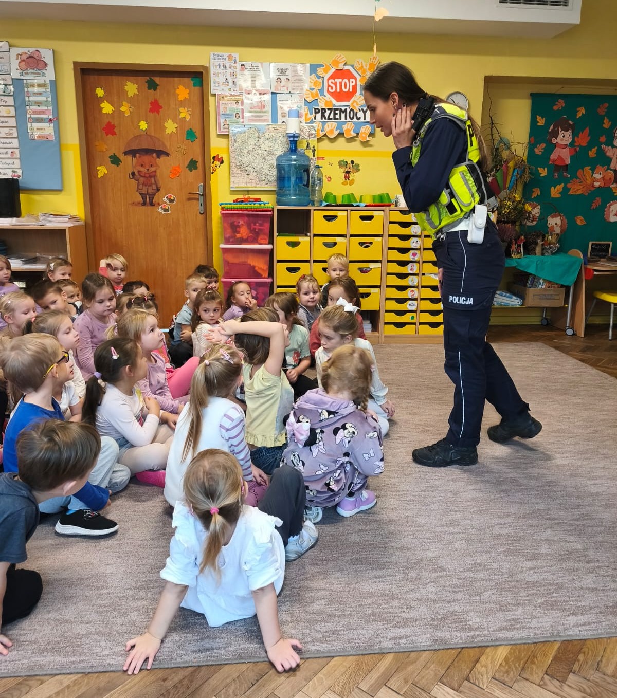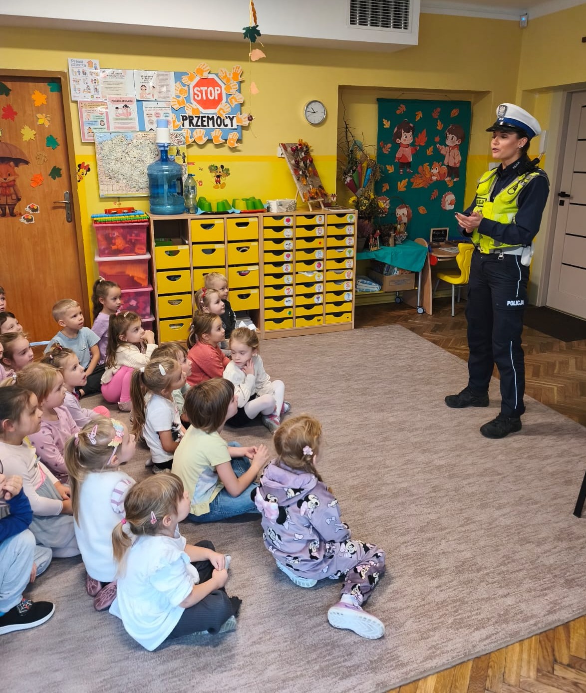 Dnia 14 października odbyło się spotkanie przedszkolaków z panią aspirant Natalią Girek z Komendy Powiatowej Policji w Pabianicach. Celem wizyty było przypomnienie podstawowych zasad bezpieczeństwa. Pani policjantka przybliżyła dzieciom podstawowe zasady bezpiecznego poruszania się po drogach. Przypominała o konieczności noszenia ubrań i obuwia posiadającego elementy odblaskowe. Największym zainteresowaniem cieszyła się prezentacja wyposażenia policyjnego umundurowania.