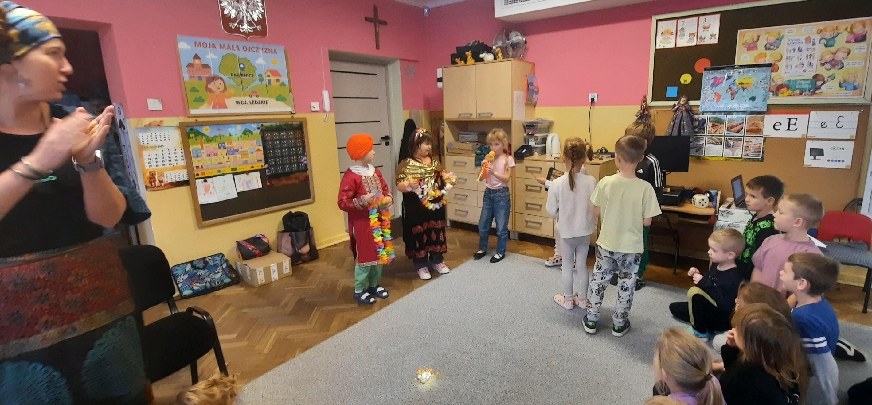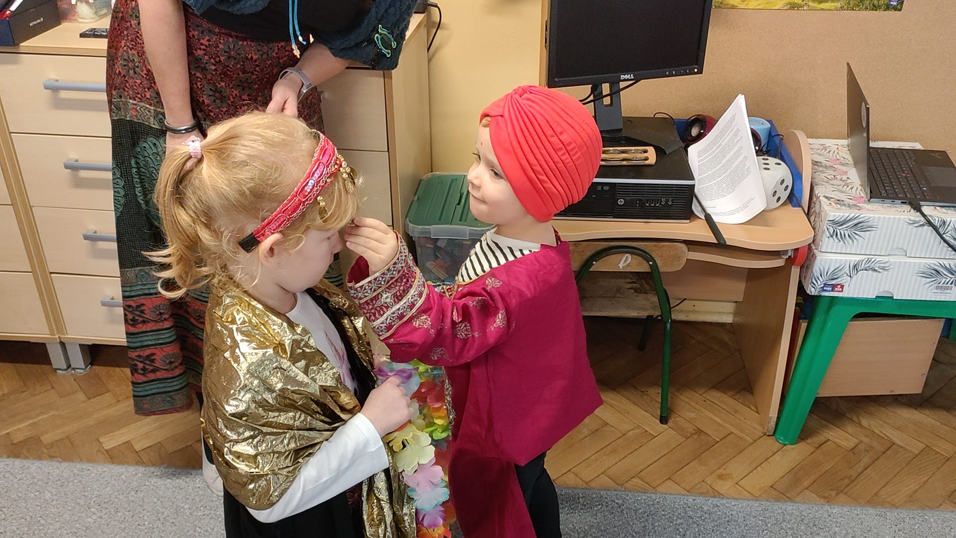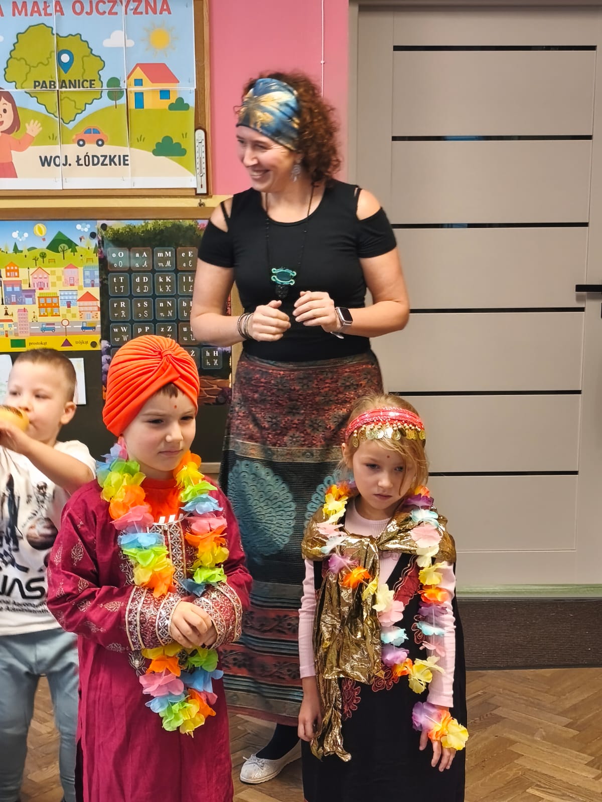 Przedszkolaki poznały tradycyjne stroje i biżuterię, indyjską muzykę i taniec. Poczuły też zapach przypraw charakterystycznych dla indyjskiej kuchni.