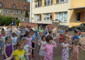 Dziś na placu przedszkonlym odbyły się zajęcia taneczne, w których wzięły udział dzieci z kiku grup. Zabawę poprowadziła pani instruktor ze Szkoły Tańca "Skrzydła".