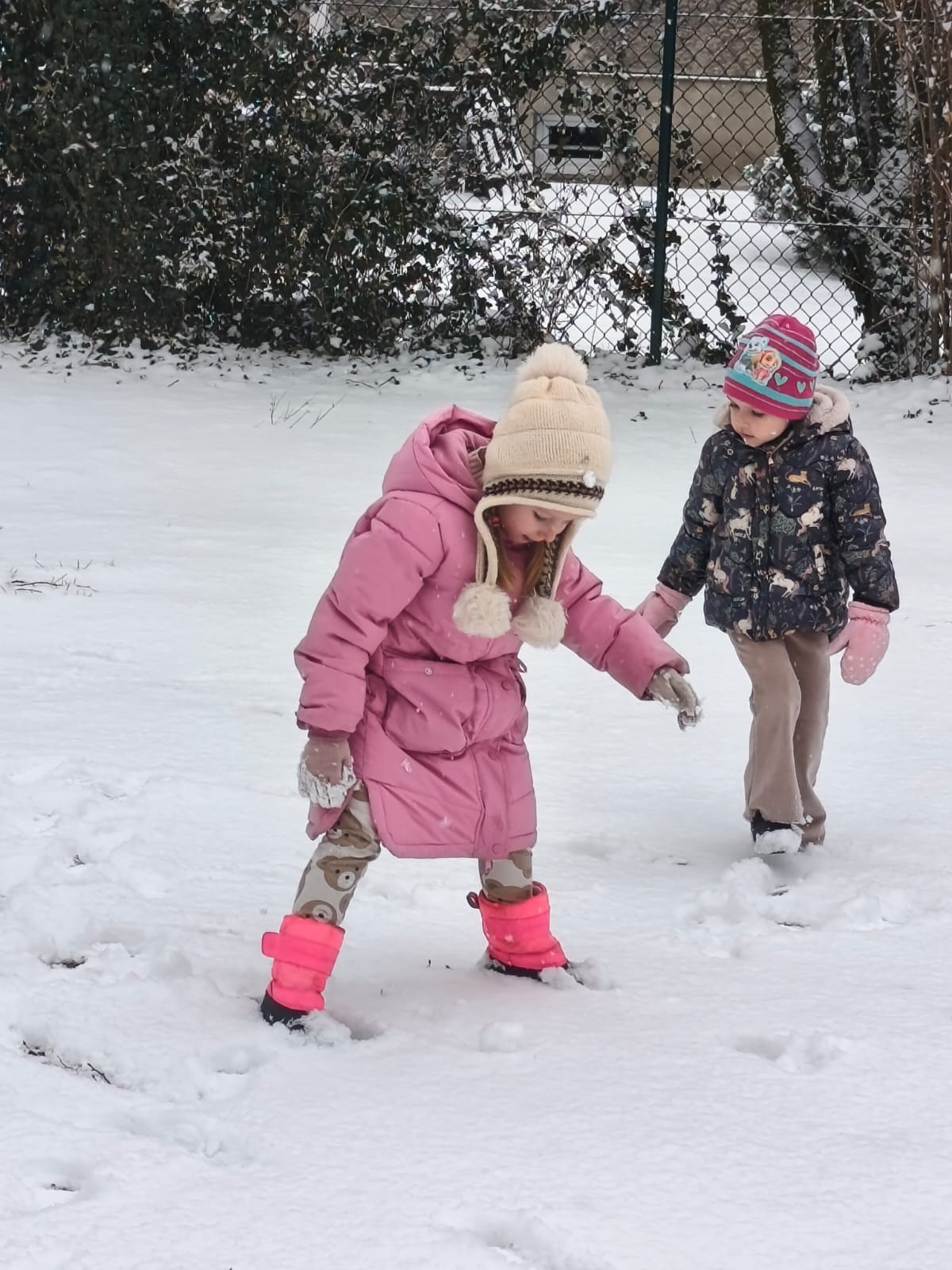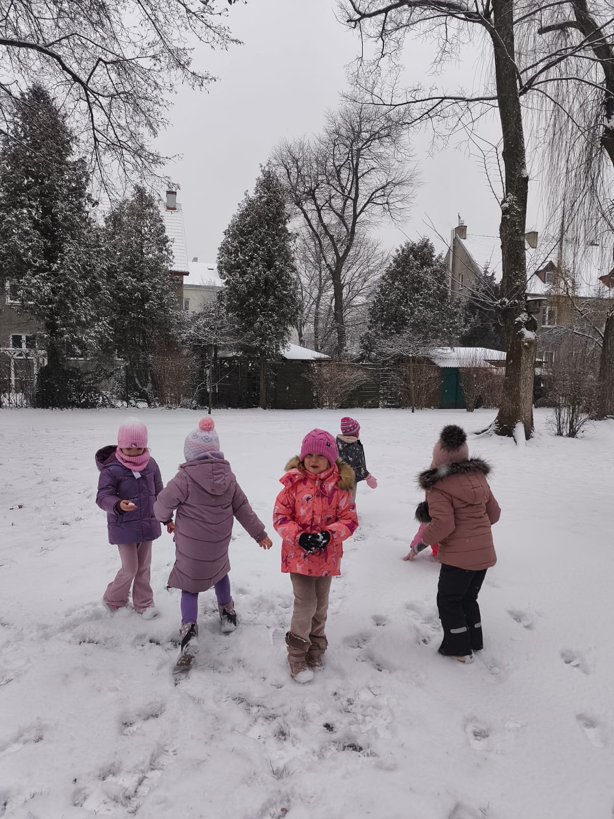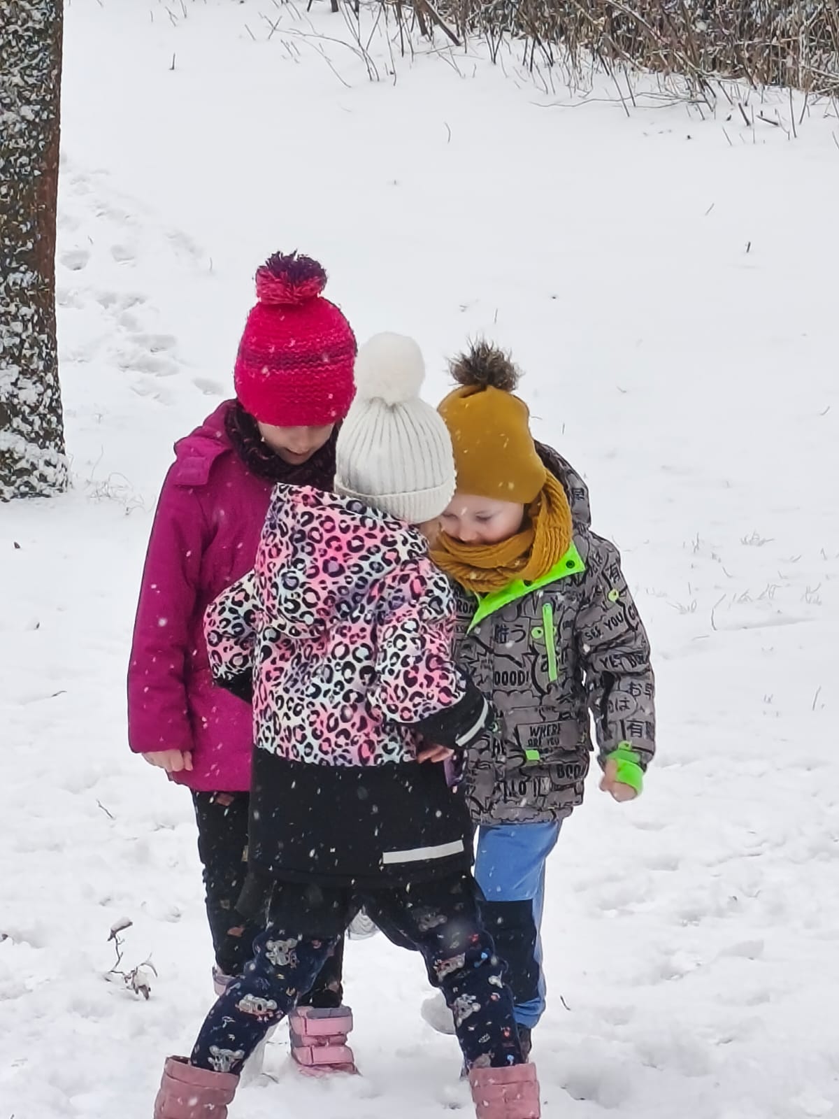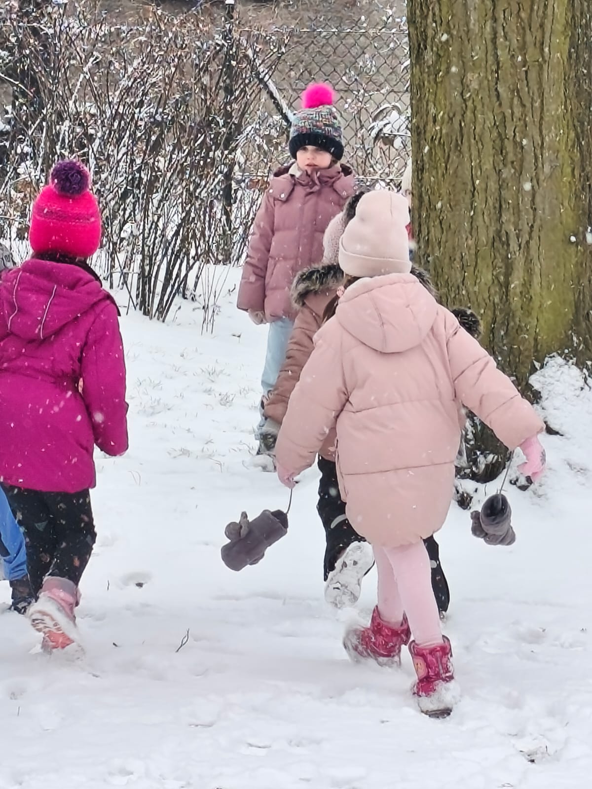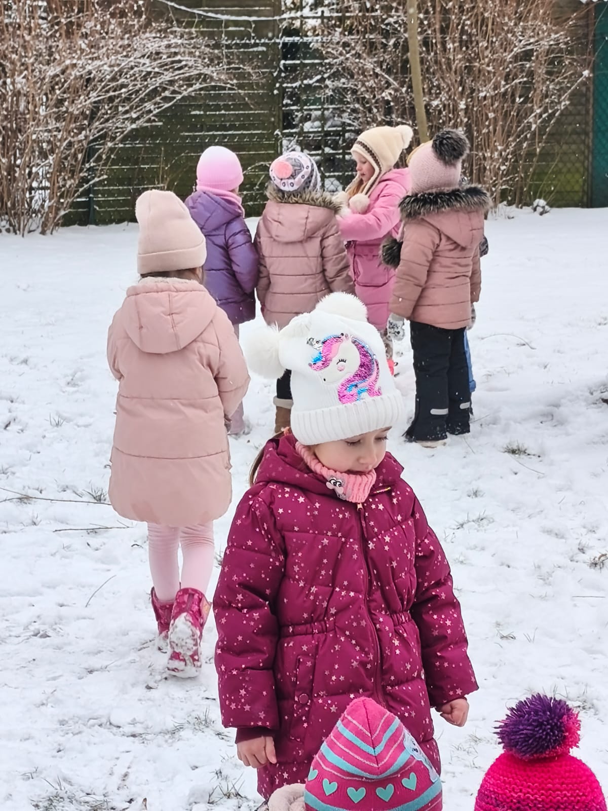 Dzieci z grupy Biedronki wybrały się do ogrodu przedszkolnego, aby skorzystać z zimowej aury.